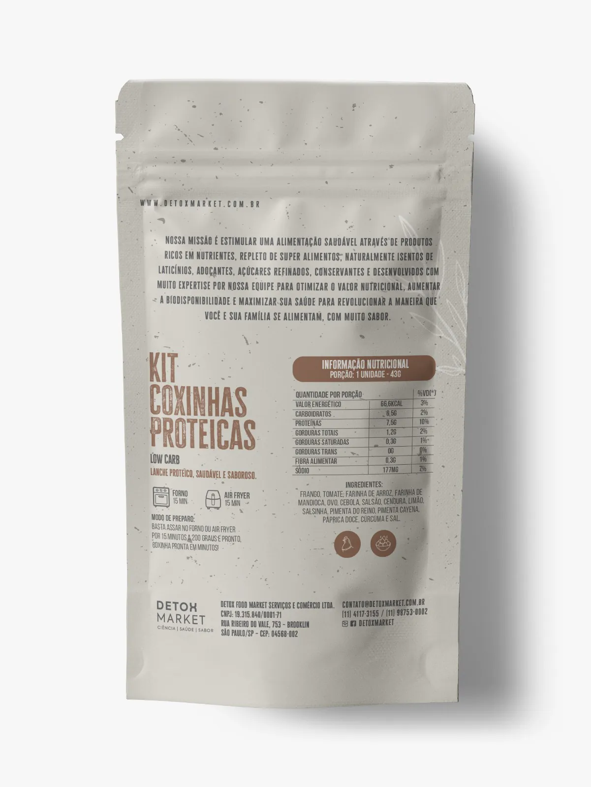 A opção ideal para quem busca uma opção de lanche proteico, saudável e saboroso. Ingredientes: frango, tomate, farinha de arroz e de mandioca, ovo, cebola, salsão, limão, pimenta do reino, cúrcuma e sal. Modo preparo: basta assar no forno ou aquecer no microondas e pronto: coxinha pronta em minutos! Peso do produto: 43g cada – kit com 8 unid.