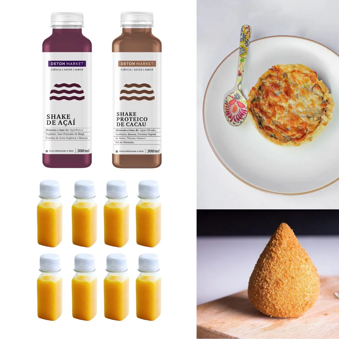 Kit contém opções saudáveis e práticas para seu café da manhã e lanches. A seleção do Gaspa contêm: 8 shots anti-inflamatórios de cúrcuma, 1 shake proteíco de açai, 1 shake proteíco de cacau, 2 coxinhas proteicas low carb, 1 quiche de costela, 1 quiche de frango, 1 focaccia. Todos os ingredientes são livres de leite de vaca e glúten.