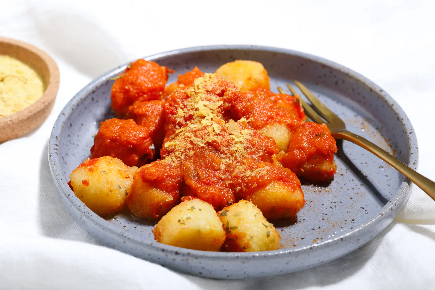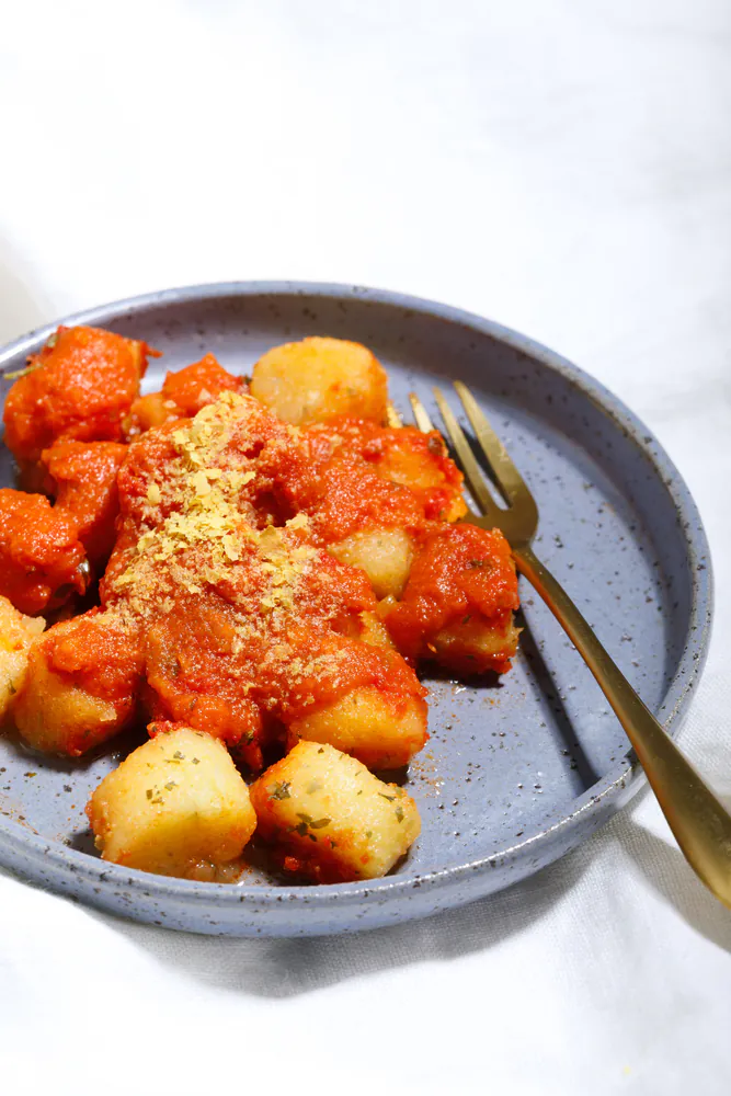 Refeição congelada sem glúten e sem leite, feita no SPA Colonial Med. Própria para microondas. Prática e saborosa! Nhoque de mandioquinha com molho de tomate. Vegano, sem glúten e sem leite. Validade 90 dias no freezer e 3 dias na geladeira.