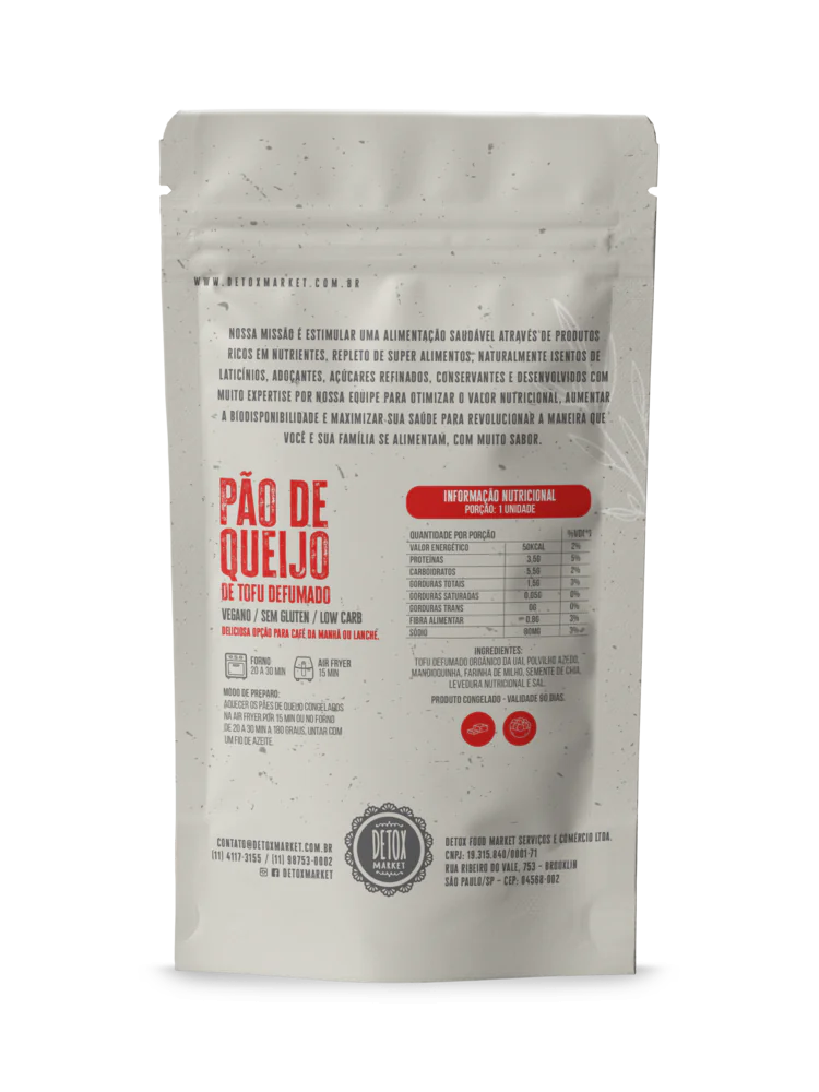 Pão de Queijo funcional sem gluten e vegano (15 unid). Ótima opção de lanche low carb. Ingredientes: tofu defumado orgânico, polvilho azedo, mandioquinha, farinha de milho, semente de chia, levedura nutricional e sal. Sugestão de consumo: aqueça na airfryer ou forninho fica delicioso e promove saciedade. Validade 90 dias no freezer, consumir em seguida depois de assar.