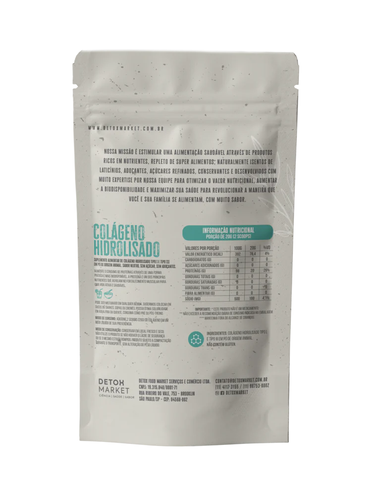 Suplemento proteico de colágeno hidrolisado tipo I e tipo III em pó de origem animal. Aumente o consumo de proteínas através de uma forma prática e mais biodisponível. Sugerimos colocar em sucos ou shakes, Sopas ou cremes, possui ótima solubilidade em água fria ou quente. Peso do produto 400g (20 porções).