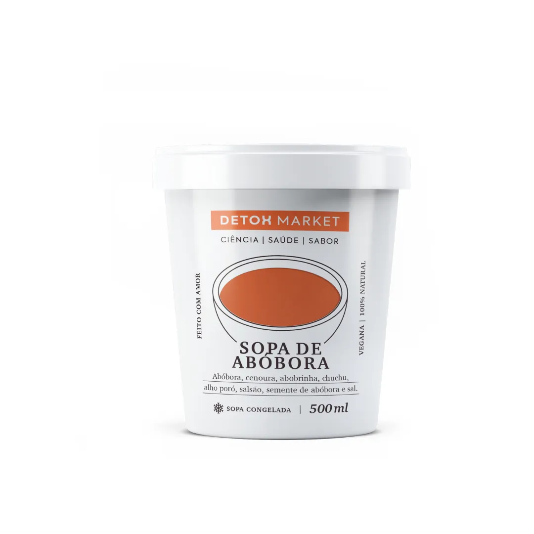 Sopa deliciosa de fácil digestão, ideal para ajudar no emagrecimento e manter alimentação saudável. Ingredientes: abóbora, cenoura, abobrinha, chuchu, alho poró, salsão, semente de abóbora, sal. Validade: 90 dias no freezer e 3 dias na geladeira. Aqueça na panela e consuma em seguida. Sugestão: adicione pão sem glúten, granola salgada ou colágeno neutro para aumentar o aporte proteico (Produto Vegano – Peso do produto: 450ml).
